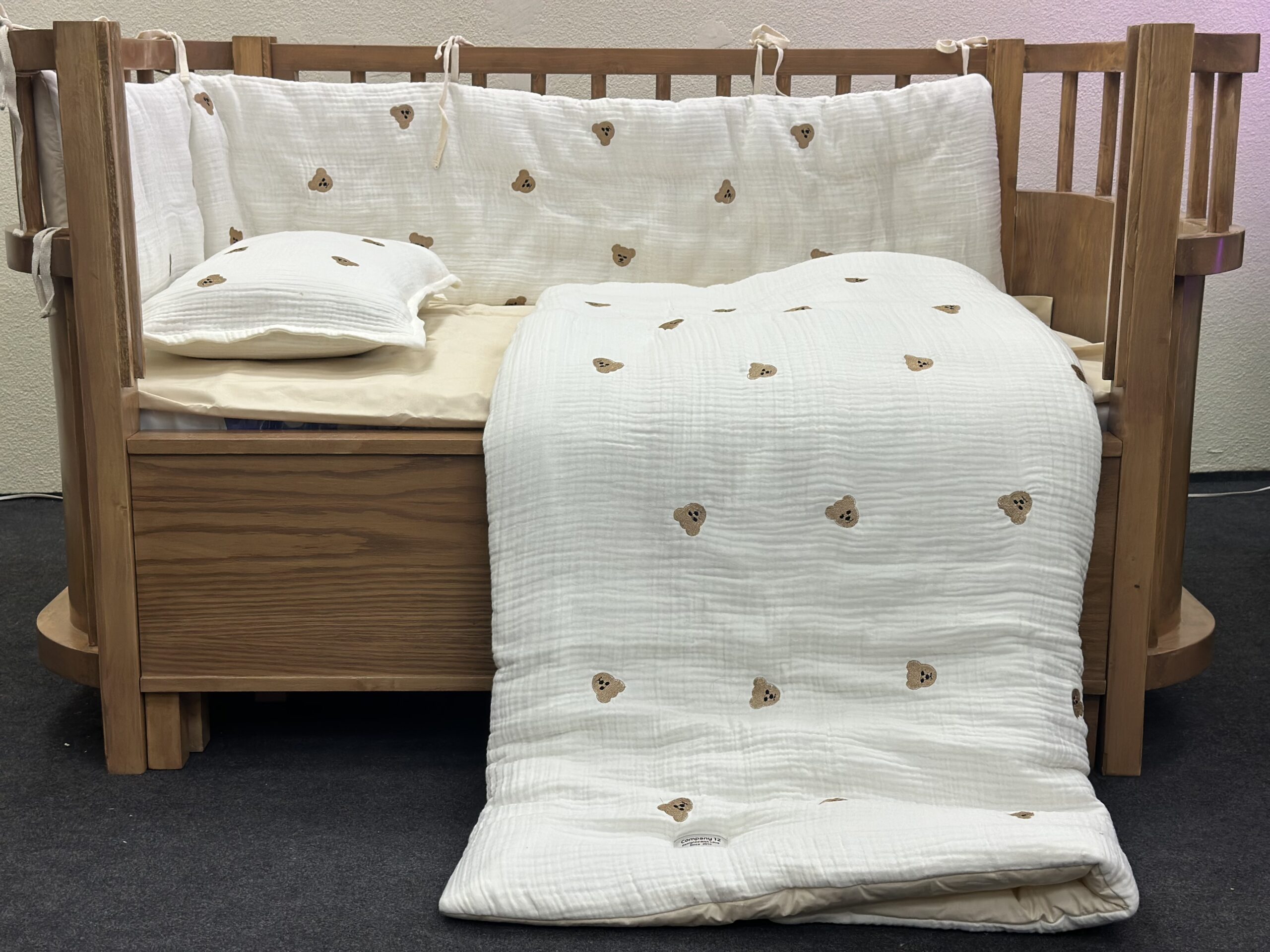 ست روتختی چهار تیکه تدی تیکهدوزی، جنس موسلین یک انتخاب ایدهآل برای اتاق کودک شماست. این روتختی با طراحی منحصر به فرد تیکهدوزی چشمدار و رنگ قهوهای آرامشبخش، زیبایی خاصی به دکور اتاق کودک میبخشد. جنس آن از الیاف طبیعی و ضدحساسیت است که به هیچوجه باعث ناراحتی یا حساسیت برای پوست نوزاد نخواهد شد.